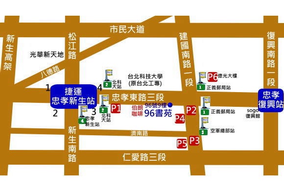 1.搭乘捷運:忠孝新生站3號出口,在忠孝東路上往東(建國南路)步行約3~5分鐘即可到達。